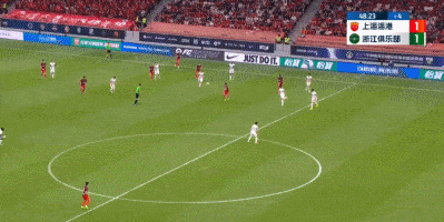 第19分钟,巴尔加斯禁区左侧犄角附近传中到门前,武磊突然启动到门前跃起后头球攻门,皮球弹地后进入球门,海港1-0领先。武磊打入赛季第17球,也是个人对阵浙江队打入的第8球。