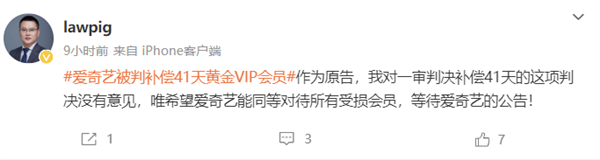 原告“lawpig”在微博发文表示对判决没有异议,并希望爱奇艺能对所有受损会员进行同等对待并公布相关公告。他解释道:“我要求的是41天补偿,法院认定爱奇艺违约并支持了这项补偿请求。因为爱奇艺从2023年1月11日开始限制投屏功能,至2月20日解除限制,所以我需要有个赔偿说法,也希望此期间所有黄金会员都能享受到。”