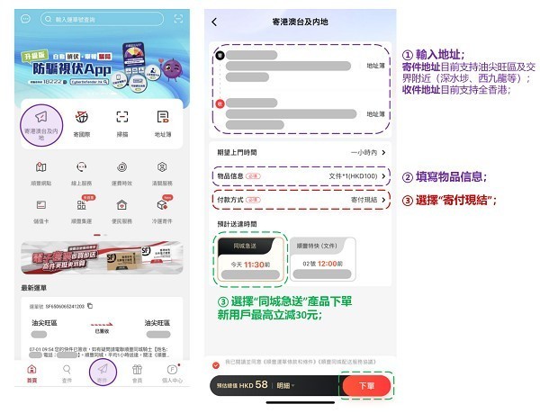 香港用户通过SFHK App,下单时点选“同城急送”服务,便可体验到顺丰同城SoFast提供的全港点到点、全品类即时配送服务。即日起全天候24小时可下单,且新老用户均可享受高额折扣优惠。