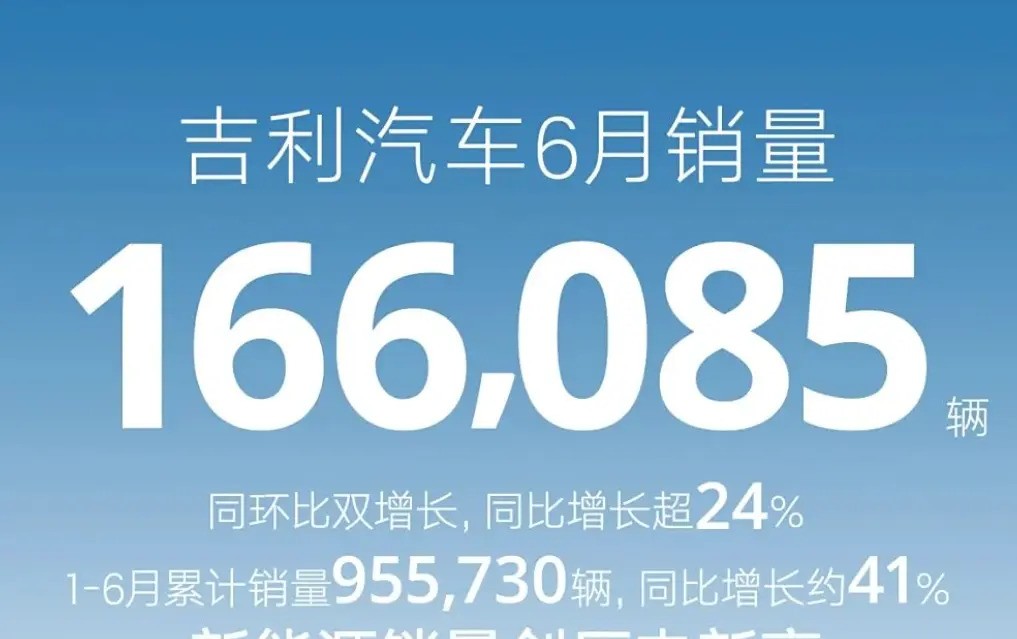 吉利汽车官方近日发布了6月销量数据,达到了166,085辆,环比增长3.2%,同比增长47.6%。1-6月累计销售955,730辆,同比增长24.8%。在新能源汽车领域,吉利汽车更是取得了辉煌的业绩,6月份新能源汽车销量达到了65,959辆。