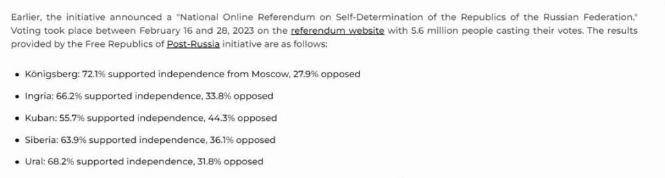 乌克兰国家资金支持运营的英语新闻网站The Gaze曾报道,由Free Nations of PostRussia Forum(FNRF)倡议并于2023年2月16日至28日发起了一项“关于俄罗斯联邦共和国自决的全国在线公投”。报道称,共有560万人投票,结果如下:柯尼斯堡(加里宁格勒市的原名)有72.1%支持脱离莫斯科独立,27.9%反对;英格里亚:66.2%支持独立,33.8%反对;库班:55.7%支持独立,44.3%反对;西伯利亚:63.9%支持独立,36.1%反对;乌拉尔:68.2%支持独立,31.8%反对。