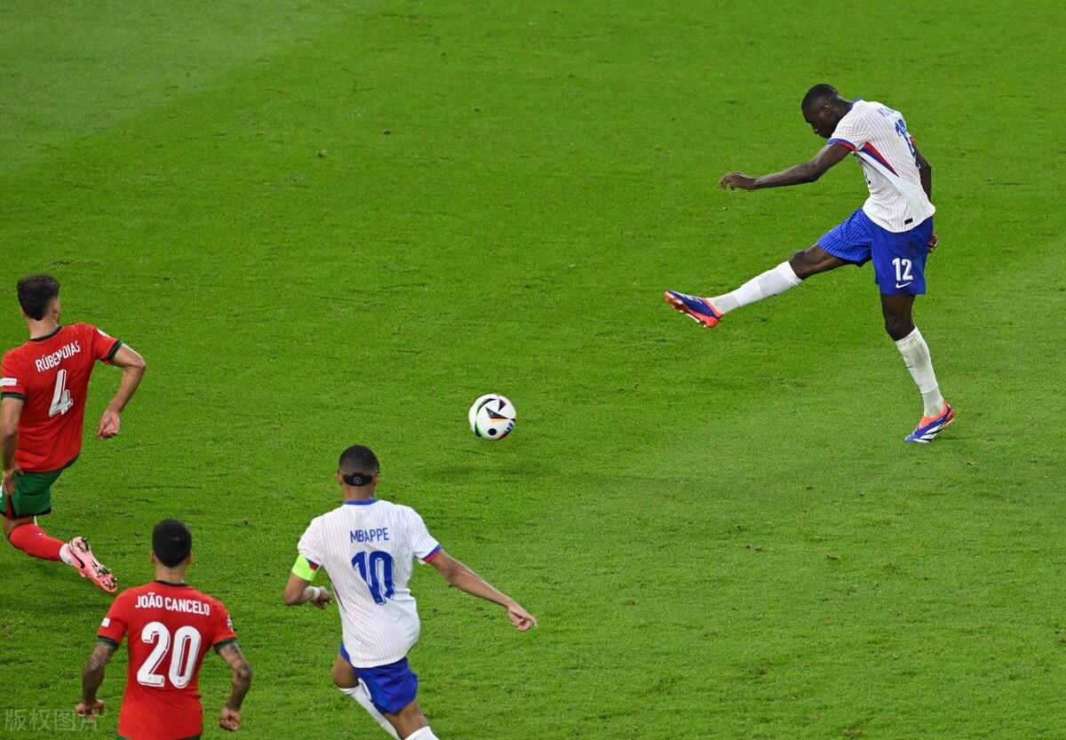 第三轮,法国队孔德一脚大力抽射把球打进,葡萄牙队菲利克斯射门打在立柱上弹出,3-2;