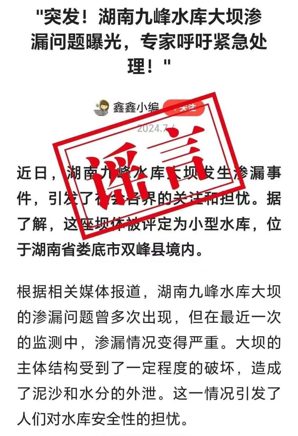 7月6日,双峰县委网信办监测到某网络平台发布文章称“近日,湖南九峰水库大坝发生渗漏事件,引发社会各界关注和担忧。据了解,这座坝体被评定为小型水库,位于湖南娄底市双峰县境内”。经核查,此为谣言!