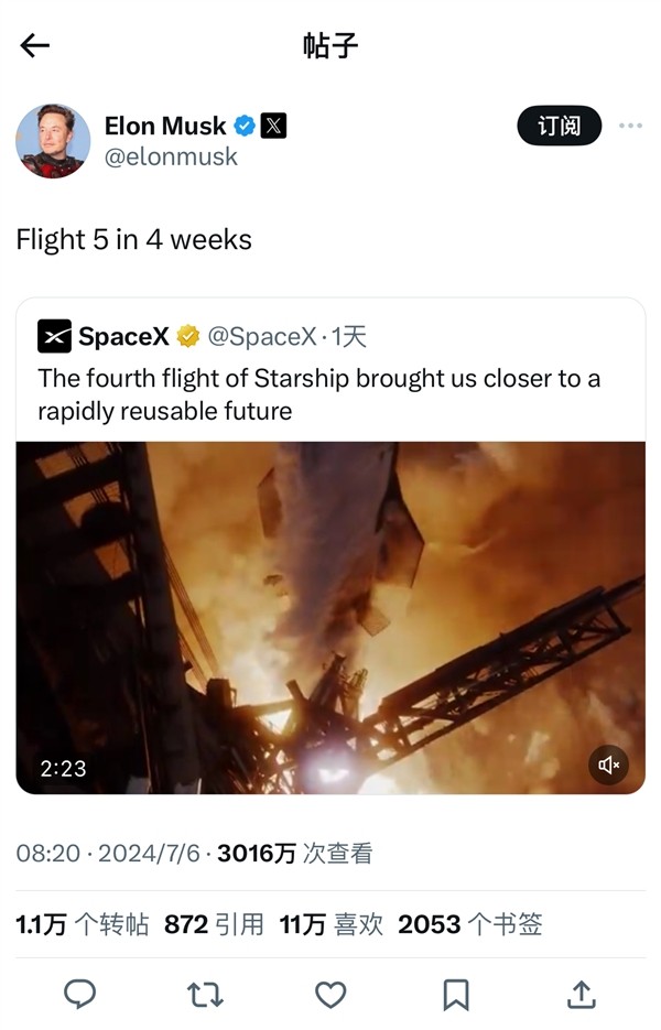 据最新消息,SpaceX的首席执行官马斯克于7月7日宣布,公司计划在接下来的4周内进行星舰的第5次轨道试飞。这标志着SpaceX在测试过程中加大了赌注。