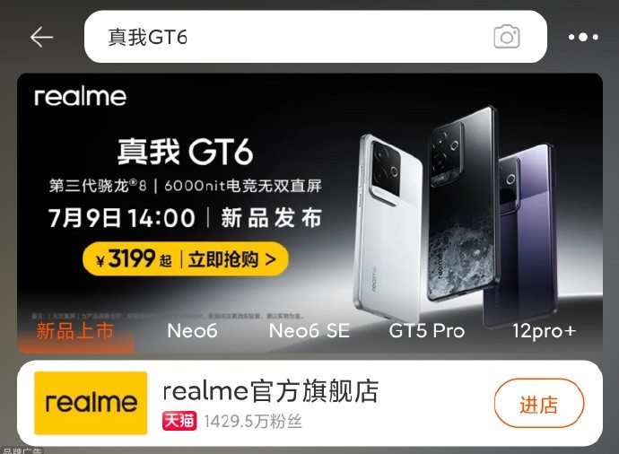 近日,真我GT6电商平台意外泄露价格,标示为人民币3199元。