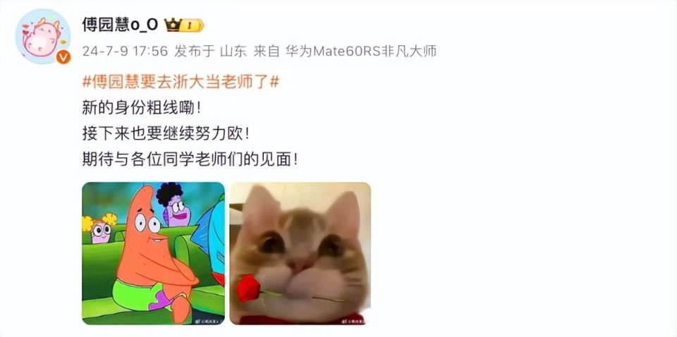 9日,傅园慧在个人账号回应:“傅园慧要去浙大当老师了,新的身份粗线(出现)嘞!接下来也要继续努力欧!期待与各位同学老师们的见面! ”