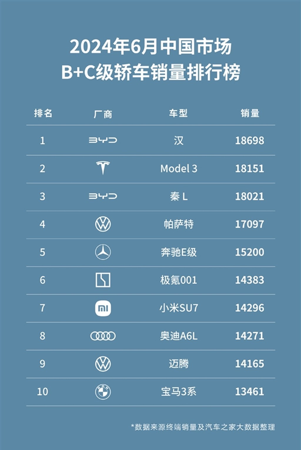 我要吐槽 弹幕 开启弹幕 评论得勋章 验证码: 看不清,换一张 发表评论 根据比亚迪汽车发布的2024年6月中国市场B+、C级轿车销量排行榜显示,小米SU7在六月份共计销售14296辆,排名第七。
