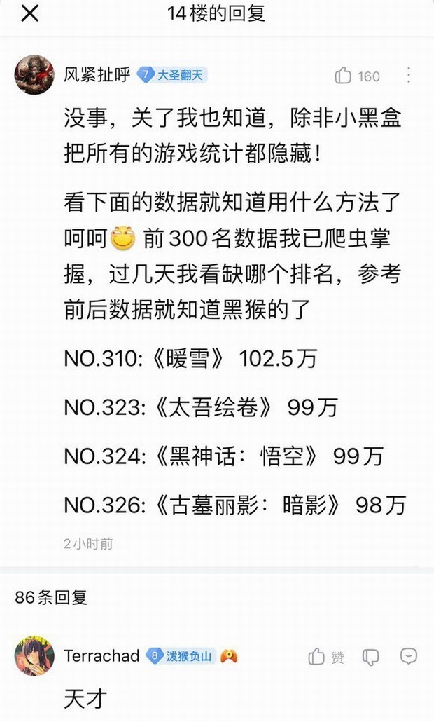 虽然目前相关软件已经关闭了数据展示功能,但是有一名玩家通过下载旧版本软件,并参考与《黑神话:悟空》排名相近的游戏销售情况来估算其Steam版预购销量,结果显示该作已经达到了100万份。这令人振奋!因为从6月8日开始预售到一个多月后的今日,如此令人瞩目的成绩确实相当不错。