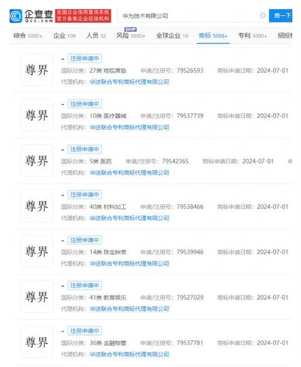 近日,有媒体报道华为技术有限公司正在密集注册多枚"尊界"商标。这些商标的国际分类涵盖了地毯席垫、医疗器械、医药等多个领域,目前均处于注册申请阶段。