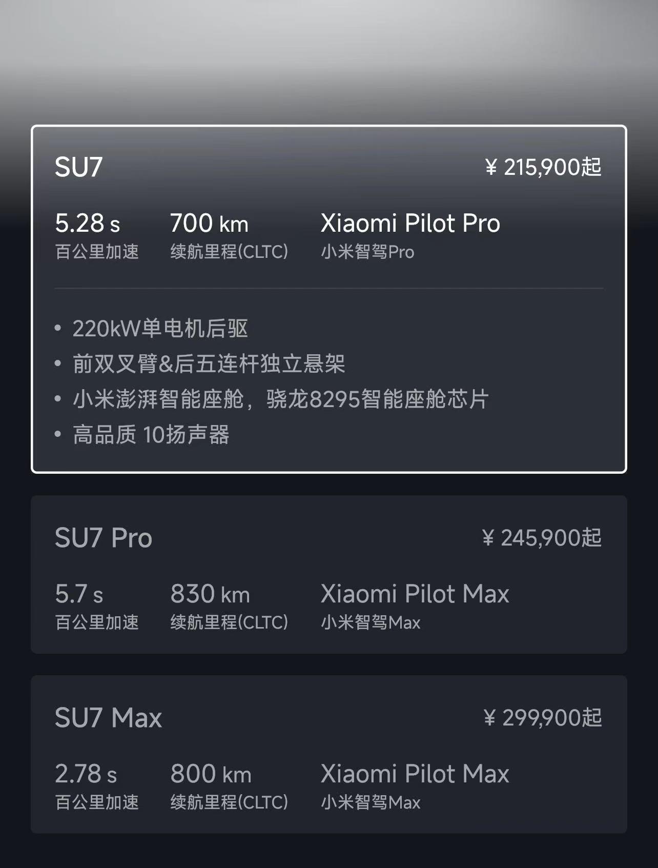 性能方面,小米SU7 0-100公里/小时加速时间为5.28秒;小米SU7 Pro 0-100公里/小时加速时间为5.7秒;小米SU7 Max 0-100公里/小时加速时间为2.78秒。