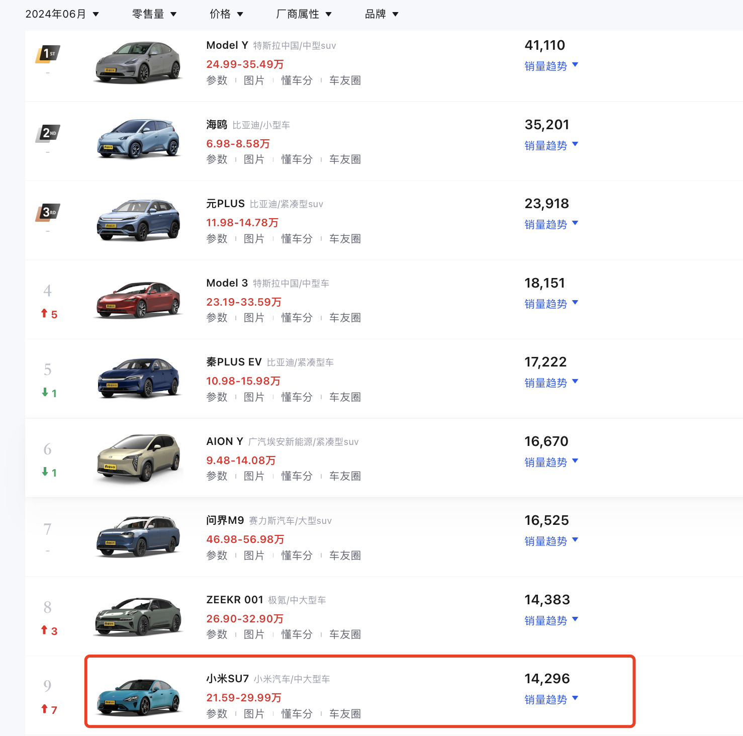 懂车帝销量榜数据显示,小米SU7在今年6月共售出14296辆,位居纯电动销量榜的第9位,第一位的仍然是特斯拉Model Y(6月销量为41110辆)。