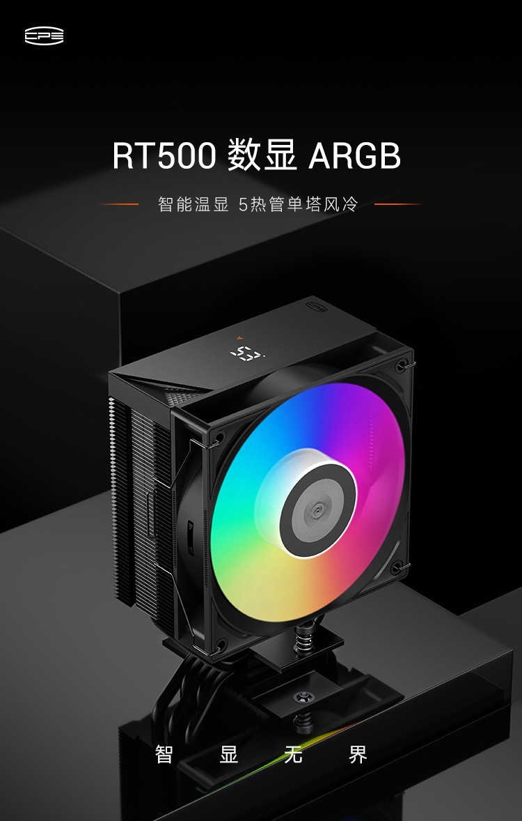 该产品采用了“三角几何”设计语言,在顶盖上安装了一个数显面板,让用户可以直观地了解CPU的工作温度。此外,RT500还配备了1颗直径为120mm的七叶HDB轴承ARGB风扇,转速范围为500-2200RPM,最大风量为73.32CFM,最大静压为3.28mmH2O。