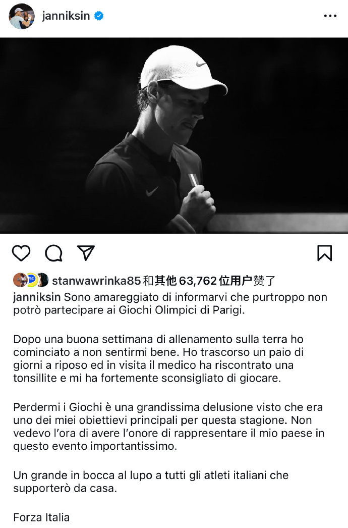 辛纳非常失望写道:“我很遗憾地告诉大家,我将无法参加在巴黎举行的奥运会。在进行了一周良好的红土训练后,我开始感到不适。我休息了几天,医生检查后发现我患有扁桃体炎,强烈建议我不要参加比赛。错过奥运会让我非常失望,因为这是我本赛季的主要目标之一。我一直期待着能有幸代表国家参加这一重要赛事。 祝我在国内支持的所有意大利运动员好运。Forza Italia。”