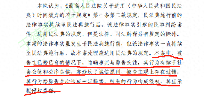 威海高技术产业开发区法院民事判决书显示,法院认为被告在已婚已育的情况下,隐瞒事实与原告交往,其行为有悖于社会公德和公序良俗,并违反诚信原则。被告主观上存在过错,其行为给原告身心造成一定损害,被告的行为构成侵权,应承担侵权责任。