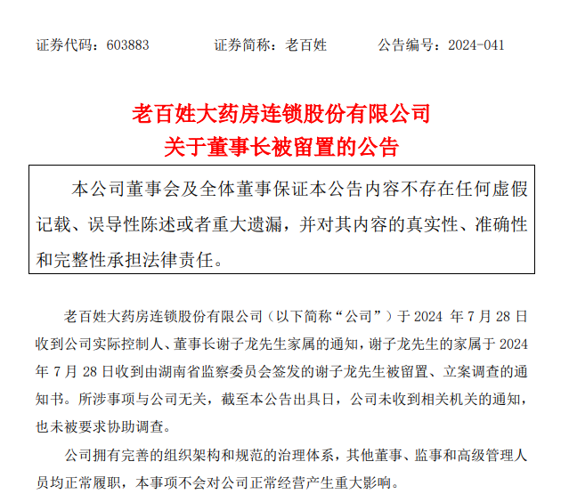 老百姓大药房称,所涉事项与公司无关,截至本公告出具日,公司未收到相关机关的通知,也未被要求协助调查。