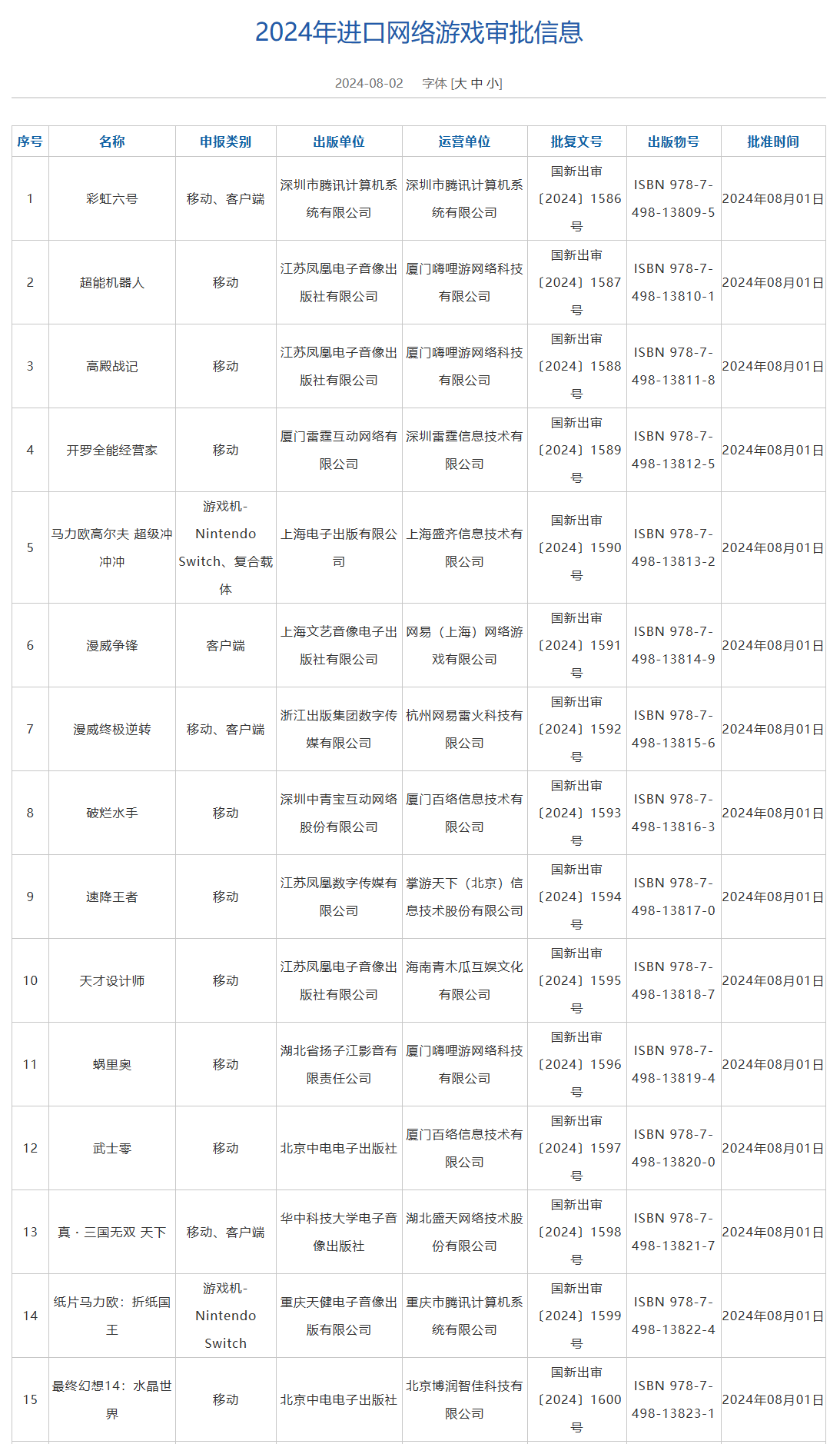 国家新闻出版署最新公布了2024年进口网络游戏审批信息,共有15款游戏通过审批。其中包括腾讯的《彩虹六号:移动》和客户端版,网易的《漫威争锋》,雷霆公司的《开罗全能经营家》,任天堂Switch上的《马力欧高尔夫超级冲冲冲》和《纸片马力欧:折纸国王》,以及《真三国无双天下》和《最终幻想14:水晶世界》。