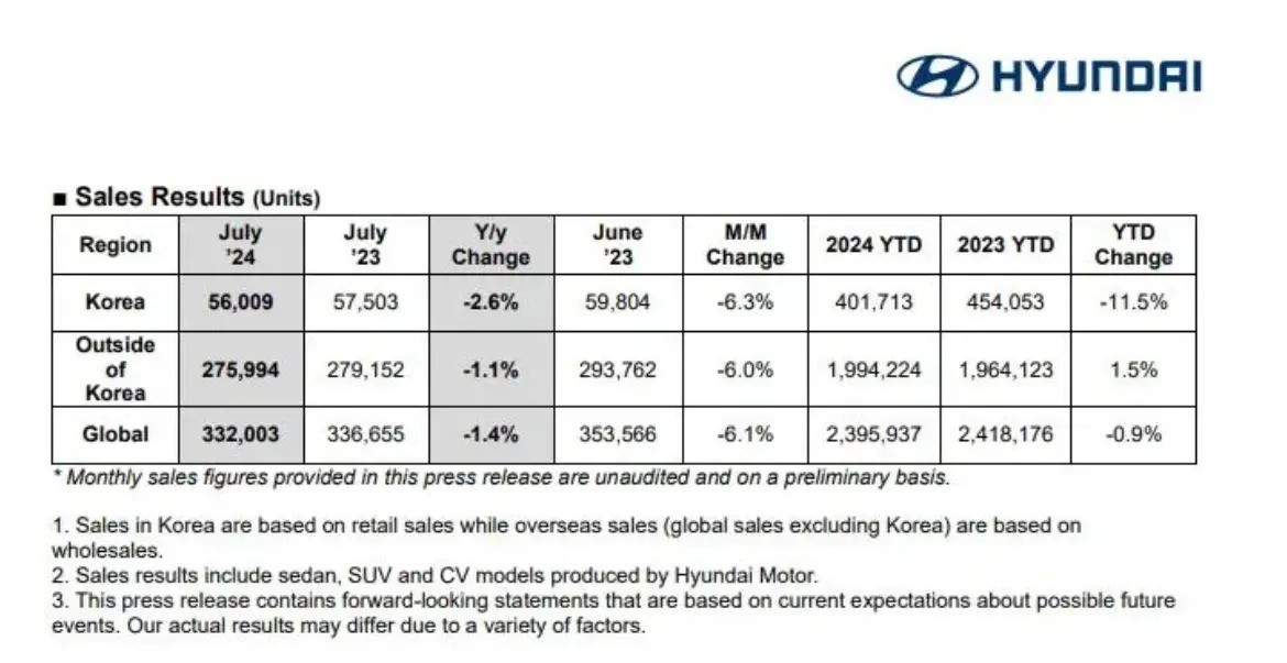 现代汽车最新全球销售数据公布,7月总销量达到332,003辆,较去年同期下降1.4%。其中,电动汽车销量近18000辆。具体来看,韩国市场销量为56,009辆,较去年同期减少2.6%;而在韩国以外的市场,销量达到了275,994辆,同比略有减少(降幅为1.1%)。