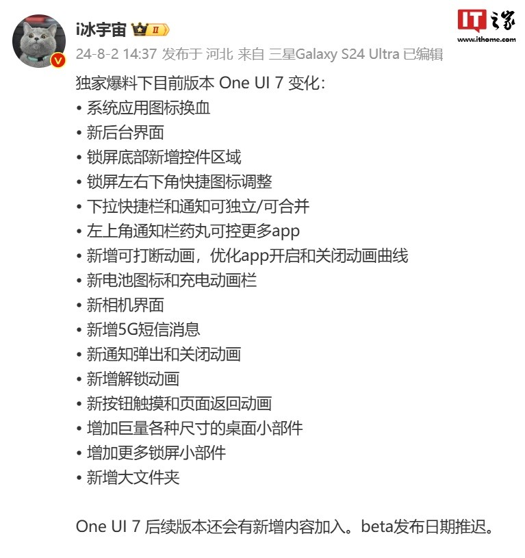 据博主报道, One UI 7 还会有后续版本的更新。Beta版发布日期可能会有所推迟。