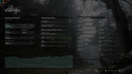 4、尽管测试工具展现的结果不错,但目前可能无法代表玩家最终的性能表现。基准测试仅让摄像头缓慢平稳地穿过森林,未加入任何快速战斗场景或粒子特效。当添加这些内容后,可能导致玩家帧率进一步波动。如果以上结果实际上已经是“最差情况”的话,那么该游戏的性能优化水平是非常不错的。更多相关信息请关注《黑神话:悟空》专区。