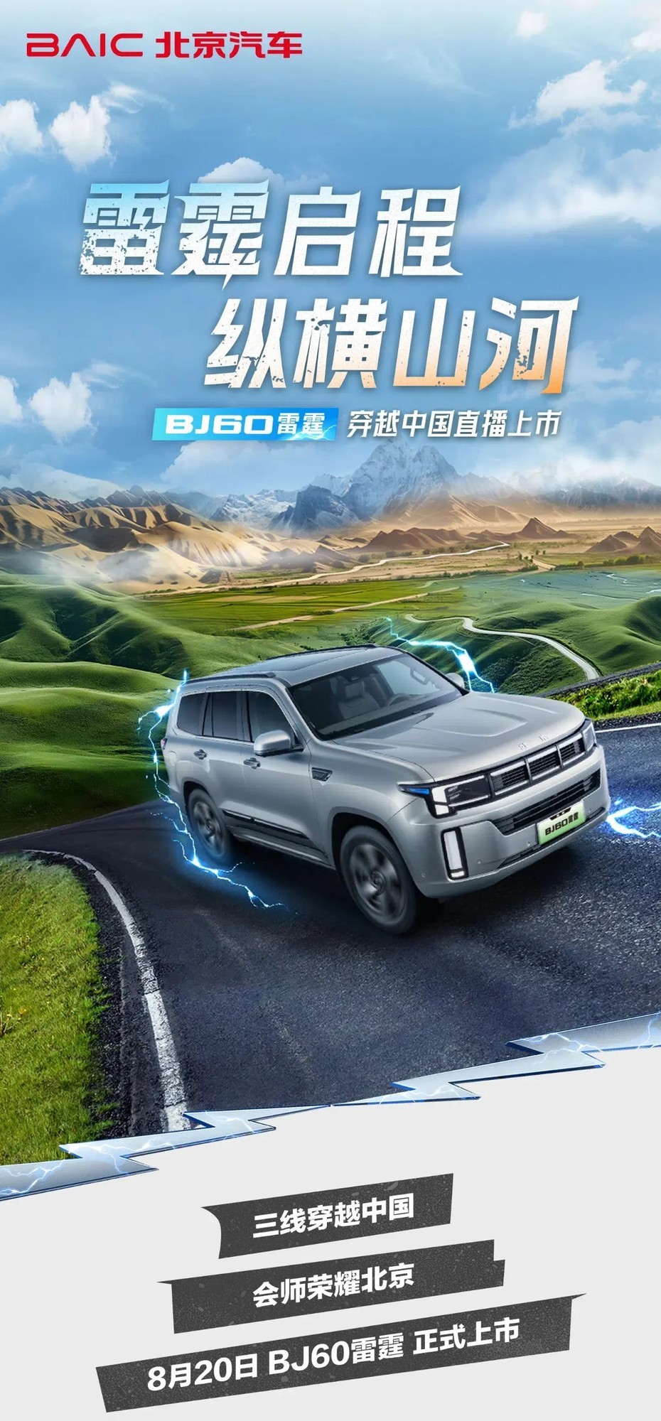 北京汽车官方于8月16日发布了新款中大型新能源越野SUV北京BJ60雷霆的上市信息。这款新车是北京汽车首款中大型新能源越野SUV,由魔核电驱平台打造。它在综合油耗方面表现出色,达到了1.3L/100km,满油满电续航突破了1200km。同时,新车提供5座和7座两种布局可选。