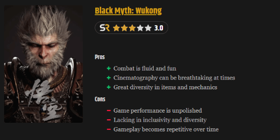 近日,《黑神话:悟空》的媒体评分已经出炉,海外知名游戏媒体screenrant给予了该游戏3星的评价。