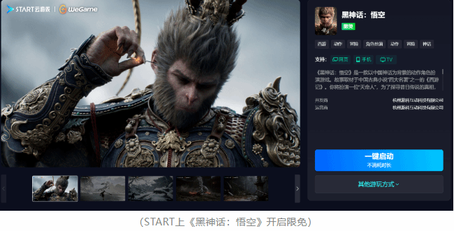 此外,START云游戏将逐步开放在Windows、Mac、掌上设备、电视以及移动平台的游玩入口,无论何时何地、使用何种设备,都能随时开始你的冒险之旅。如果你已经购买了WeGame版本的《黑神话:悟空》,在云游戏免费阶段内无需额外消耗时间或开通会员服务即可享受游戏乐趣。
