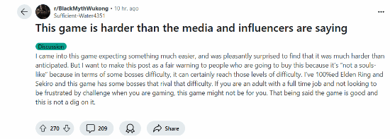 网友在帖子中表示,《黑神话:悟空》的难度出乎意料地高,并认为一些BOSS的挑战性极高,这使得那些希望购买这款游戏的人产生了疑问。但这位作者也指出,这不是对《黑神话:悟空》本身的贬低,而是向有意购买此款游戏的玩家们提出建议。