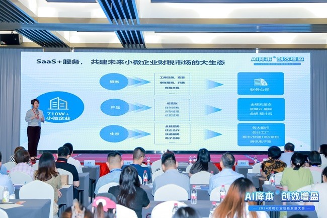 金蝶中国微型产品部总经理戴婷女士为现场客户讲述了《AI时代下,微型企业财税生态共赢之路》,她指出随着技术革新,信息的处理方式、载体和呈现方式等方面出现变化,数据从“孤立”走向了 “互联”,但是财务的本质没有变化。AI技术爆发,小微企业财税管理需求需要借助AI降本、增效、提质。其中,金蝶 SaaS 提供全方位业务管理和智能财税管理,包括智能记账、申报、分析等功能,未来将共建小微企业财税市场大生态。