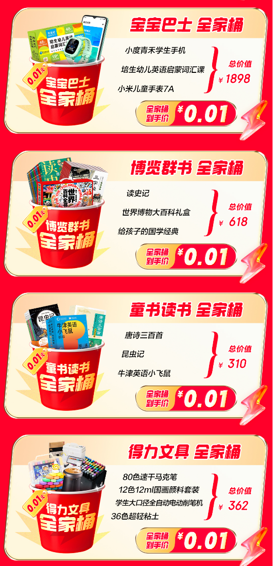 想在暑假期间给孩子准备学习好物,可以关注科大讯飞全家桶,内含翻译笔P20Plus、E听说单词通E100、科大讯飞学习机T20周年礼盒版、AI语文本C9四款产品,总价值15596元。此外总价值1898元的宝宝巴士全家桶、总价值618元的博览群书全家桶、总价值310元的童书读书全家桶、总价值362元的得力文具全家桶也覆盖了中小学生的主要学习需求,家长们可以同步关注。