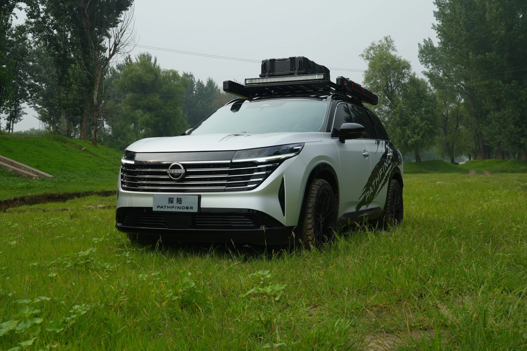 车身侧面,新款探陆增设了车顶行李架、置物架及车边天幕等装备,显著增强了其装载能力和露营便利性。同时,新车换装了全新轮圈设计,结合双色车身,视觉效果更为出众。尾部部分也有所改变:狭长的尾灯组搭配中央黑色饰板及品牌LOGO,下方还标有Pathfinder车型名称,层次分明,提升了整体辨识度。