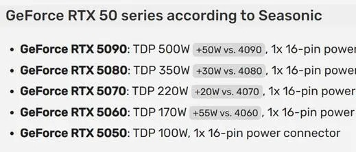 根据海韵官网显示的信息,RTX 50系列显卡的热设计功耗(TDP)相较于前一代RTX 40系列有了显著提升,预示着新系列显卡在性能上或将有更大突破。以下是具体型号与对应TDP功耗的对比: