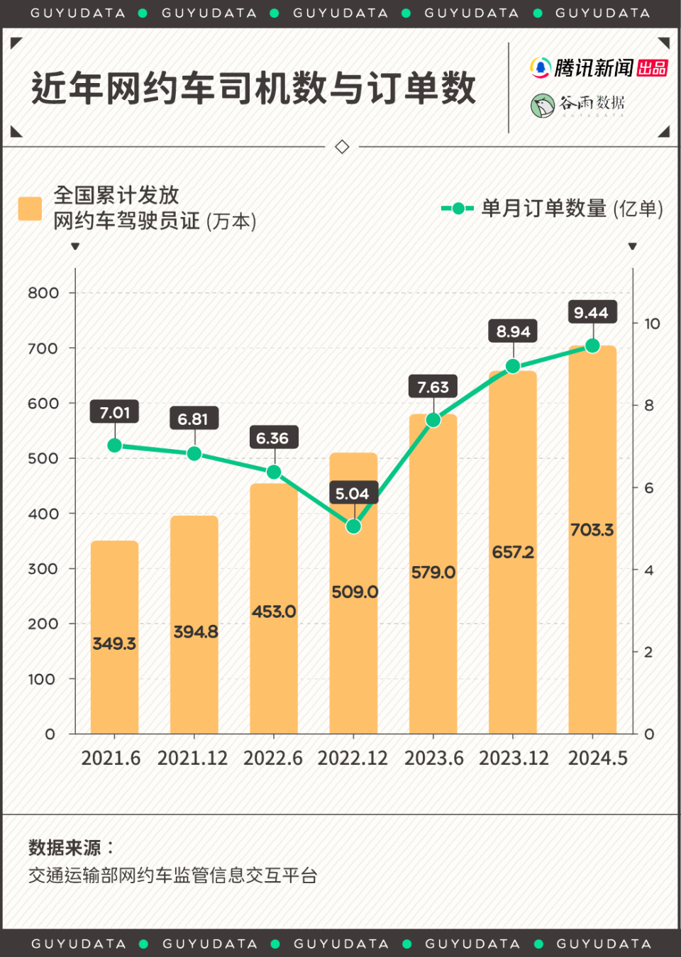 根据交通运输部公布的最新数据,到2024年5月,全国持证上岗的网约车司机有703.3万人。而2021年6月时,这个数据还不到350万。短短3年之间,网约车司机数量增长超过100%,但每月的订单总数增长不到35%。