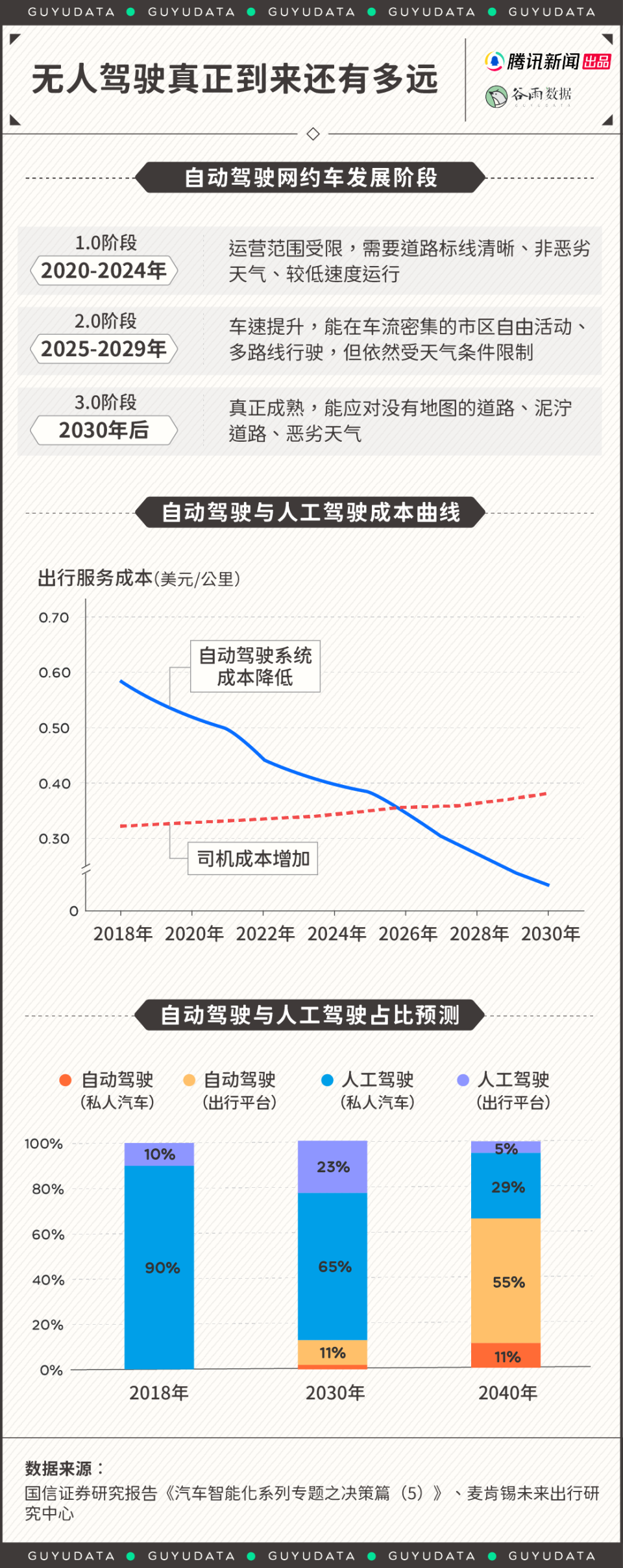 国信证券近期发布的调研报告预测,2030年后自动驾驶网约车才能真正成熟,可以应对所有道路和天气状况。