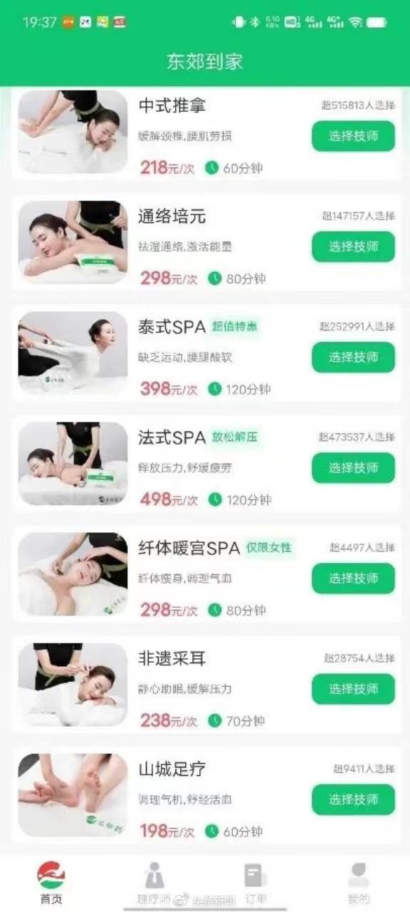 于是,他就打开了“东郊到家”软件,看了一下价格基本上都在300元,最便宜的也要218元,他选择了一个女技师,就下单了。