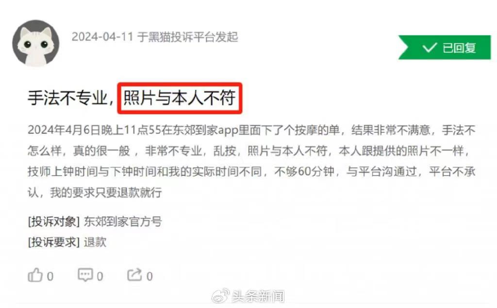 4月11日,他向“东郊到家”提起投诉,说给他服务的女技师一点都不专业,照片与本人不符,让他很不满意,而且提供服务的时间根本不够60分钟。