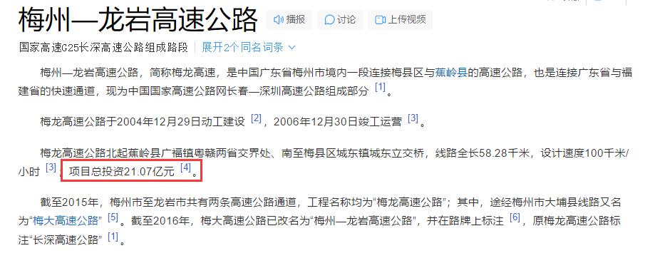 根据公开资料显示,梅龙高速公路于2004年12月29日动工建设,2006年12月30日竣工运营。该项目总投资为21.07亿元。