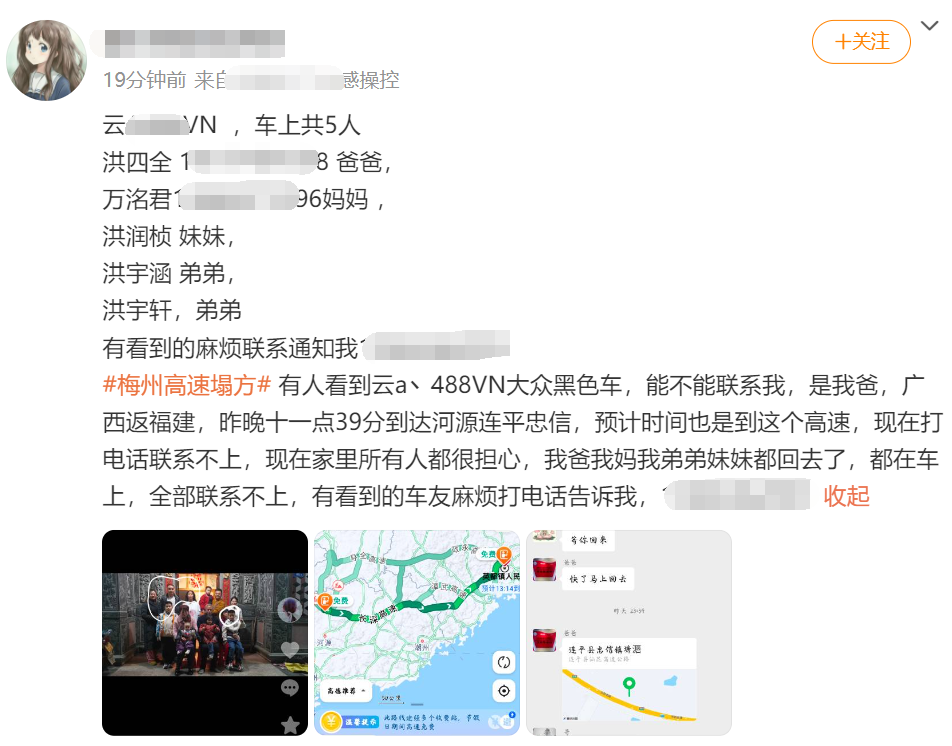 一位网友在网上发文寻人,称自己的爸爸妈妈还有弟弟妹妹都在一辆车上,他们是从广西返回福建的,可如今全部都联系不上了,手机也打不通。