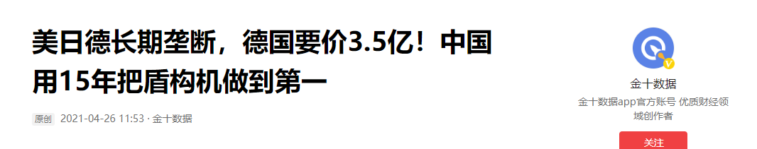 金十数据:美日德长期垄断,德国要价3.5亿!中国用15年把盾构机做到第一