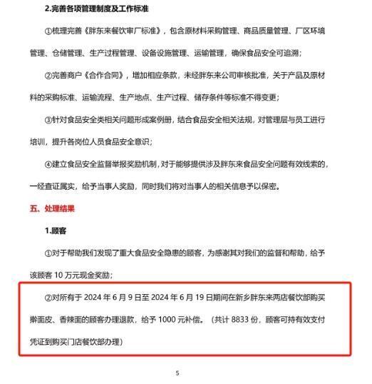 对于该事件的处理结果,报告中提到:对于帮助我们发现了重大食品安全隐患的顾客,为感谢其对我们的监督和帮助,给予该顾客 10 万元现金奖励;所有于 2024年6月9日至2024年6月19日期间在新乡胖东来两店餐饮部购买擀面皮、香辣面的顾客办理退款,给予1000元补偿(共计8833份)。