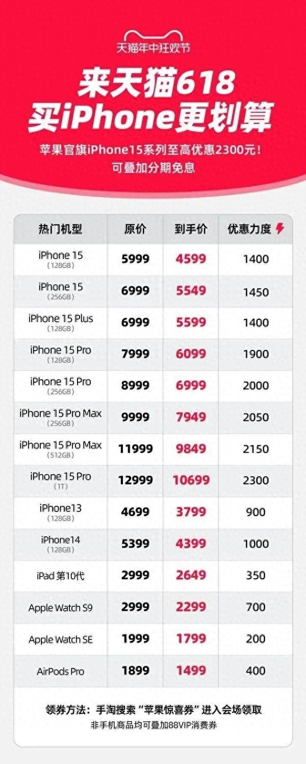 其中,优惠幅度最大的为iPhone 15 Pro 1TB版本,从原价的12999元直接降到10699元,差价达到2300元。