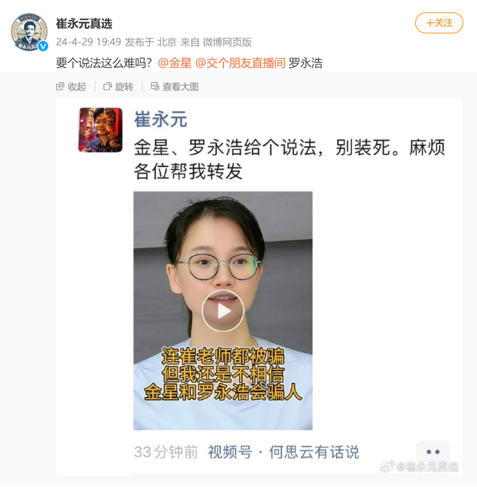 交个朋友回应崔永元喊话罗永浩卖骗子产品:不存在,从未提及有减肥功效