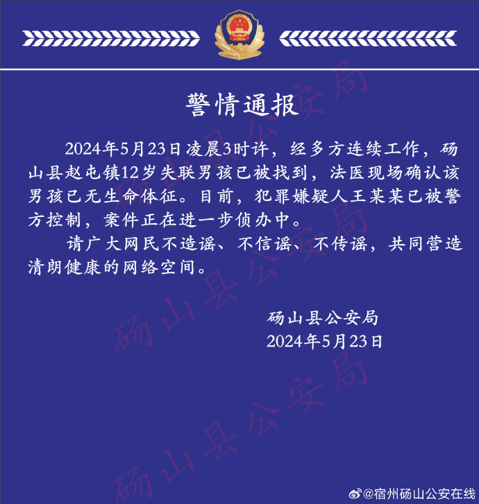 砀山县公安局通报,5月23日凌晨3时许,经多方连续工作,硕山县赵屯镇12岁失联男孩已被找到,法医现场确认该男孩已无生命体征。目前,犯罪嫌疑人王某某已被警方控制,案件正在进一步侦办中。