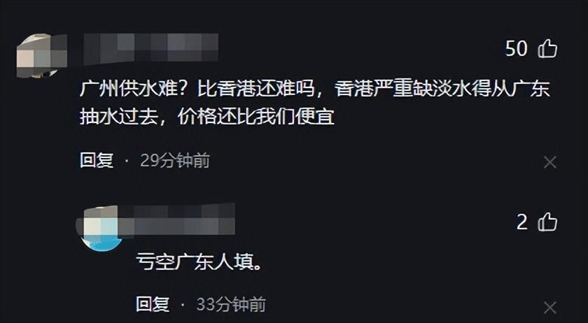 这位网友则说,广州供水难?比香港还难吗,香港严重缺淡水得从广东抽水过去,价格还比我们便宜!