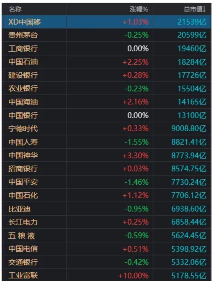 其中,中国石油盘中涨超3%,市值近1.9万亿元;中国神华涨超3%,市值8800多亿元;工业富联涨停,市值超5000亿元。