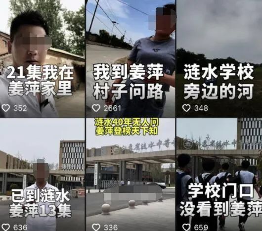 有人专门跑到姜萍老家拍了几百段视频,自己的那张大脸占了半屏。