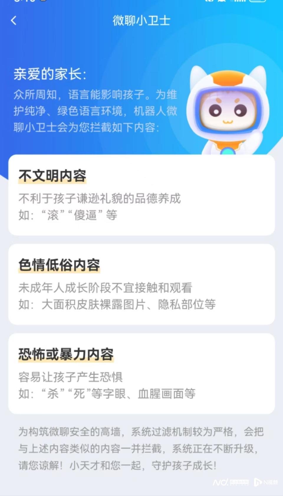 其中,“不文明内容”不利于孩子谦逊礼貌的品德养成,如:“滚”“傻逼”等;“色情低俗内容”,未成年人成长阶段不宜接触和观看,如:大面积皮肤裸露图片、隐私部位等;“恐怖或暴力内容”,容易让孩子产生恐惧,如:“杀”“死”等字眼、血腥画面等。系统提示:“为构筑微聊安全的高墙,系统过滤机制较为严格,会把与上述内容类似的内容一并拦截,系统正在不断升级,请您谅解!”