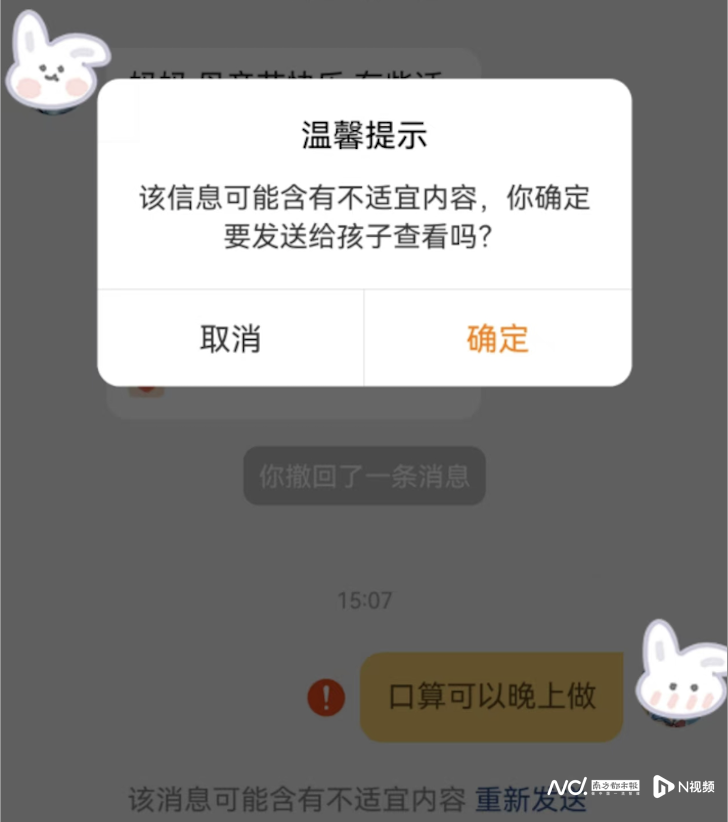 不过,南都记者也发现,在电话手表App上,触发违禁词后提醒旁边,有“重新发送”的按钮,点击后会弹出“温馨提示”,告诉家长“该信息可能含有不适宜内容,你确定要发送给孩子查看吗?”家长点击确定即可解禁发送。