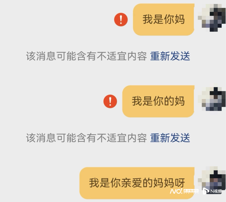 还有网友晒出的截图显示,发送“我是你妈”“我是你爸”“再不回来打死你”“腿给你打断”等文字,也提示含有不适宜内容。