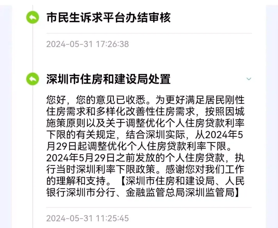 日前,有深圳市民就调整优化个人住房贷款利率下限咨询“深圳12345热线”。深圳市住房和建设局、人民银行深圳市分行、金融监管总局深圳监管局回复表示:为更好满足居民刚性住房需求和多样化改善性住房需求,按照因城施策原则以及关于调整优化个人住房贷款利率下限的有关规定,结合深圳实际,从5月29日起调整优化个人住房贷款利率下限。5月29日之前发放的个人住房贷款,执行当时深圳利率下限政策。
