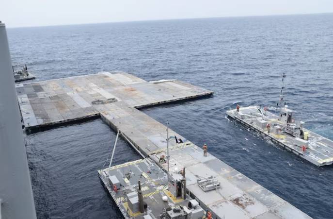 以色列第12频道5月25日报道称,在强烈风浪的冲击下,这处临时码头当天有部分结构脱落并漂入海中,美军人员随后将其拖回并重新进行了固定。